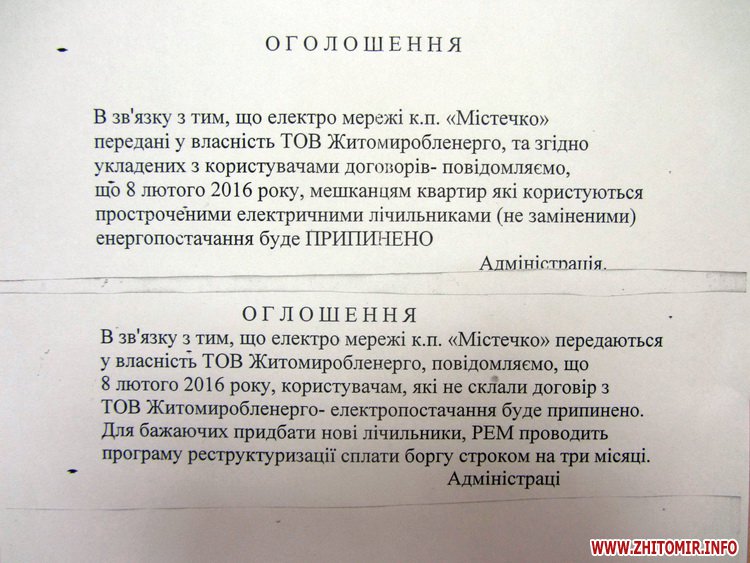 «Тим, хто відмовляється це робити, погрожують відключити світло. В оголошеннях, які розклеїли у під’їздах, міститься погроза з 8 лютого відключити від енергопостачання споживачів, які користуються простроченими (не заміненими) електричними лічильниками», - говорить депутат Миропільської селищної ради Володимир Лесько.
