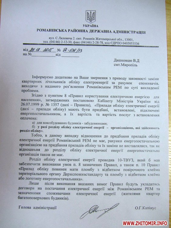 «Згідно з Правилами користування електричною енергією, енергопостачальник зобов'язується проводити планову повірку, ремонт і заміну приладів обліку в терміни, встановлені нормативно-технічними документами та договором. Енергопостачальник безплатно здійснює планові повірку, обслуговування та ремонт приладів обліку, крім випадків пошкодження, втрати або неправильної роботи приладу обліку з вини споживача. Тобто, у людей вже є лічильники, і їх заміну має проводити за свій кошт компанія «Житомироблернерго», або його підрозділ – Романівський РЕМ. Людей же поставили перед фактом: або вони купують лічильники самі, або з ними відмовляються укладати договір на електропостачання і погрожують відрізати світло», - розповідає Володимир Лесько.