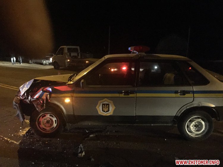 «Близько 17.20 на перехресті Київського шосе та провул. Старокиївського в обласному центрі автомобіль ВАЗ-2107, за кермом якого знаходився 29-річний житель м. Коростишева, здійснив зіткнення зі службовим автомобілем поліції ВАЗ-21099, що рухався попереду у попутному напрямку і зупинився (з відповідно увімкненим покажчиком повороту) для виконання маневру повороту вліво. Попередньо встановлено, що водій ВАЗ-2107 не вибрав безпечної швидкості та не помітив службового автомобіля поліції, у результаті чого здійснив зіткнення передньою лівою частиною транспортного засобу у задню праву частину поліцейського авто. Внаслідок цього службовий автомобіль відкинуло на смугу зустрічного руху, де відбулося друге зіткнення із транспортним засобом «Chevrolet Aveo» під керуванням житомирянина, який рухався у сторону обласного центру і після удару зупинився, зіткнувшись з електроопорою на узбіччі. Ніхто з учасників дорожньо-транспортної пригоди тілесних ушкоджень не отримав», – повідомили в поліції.