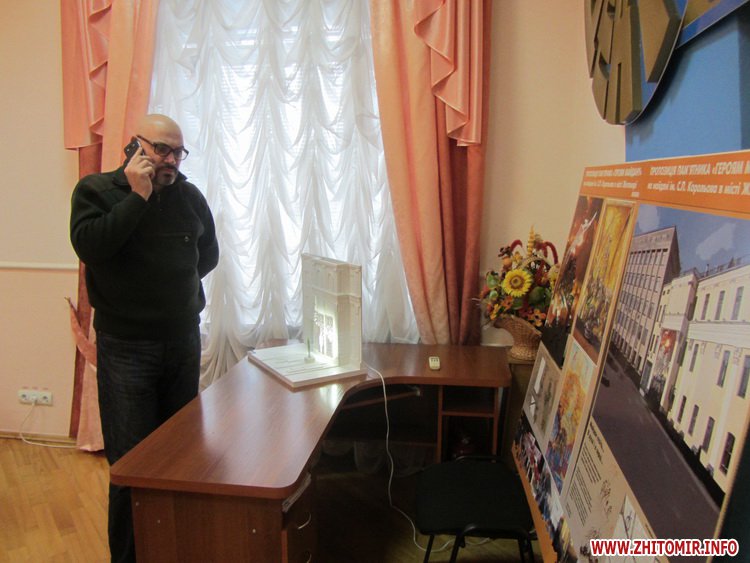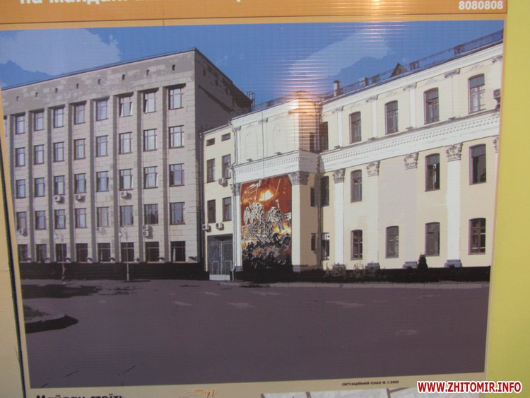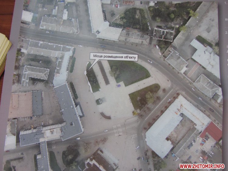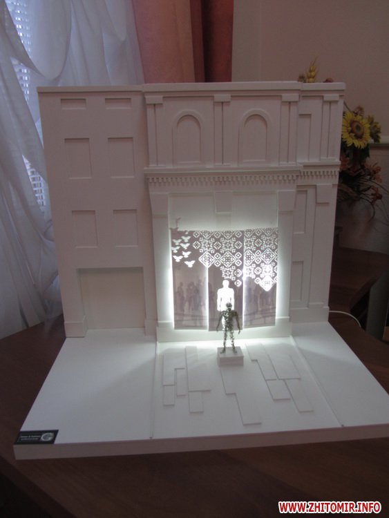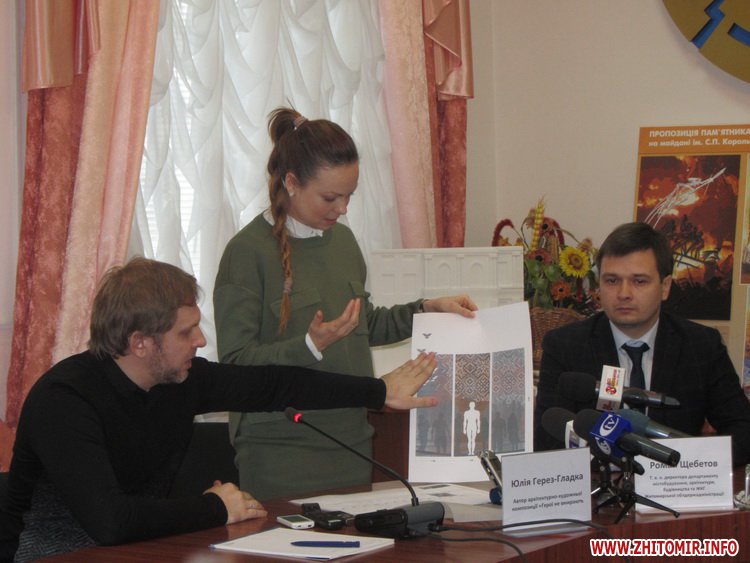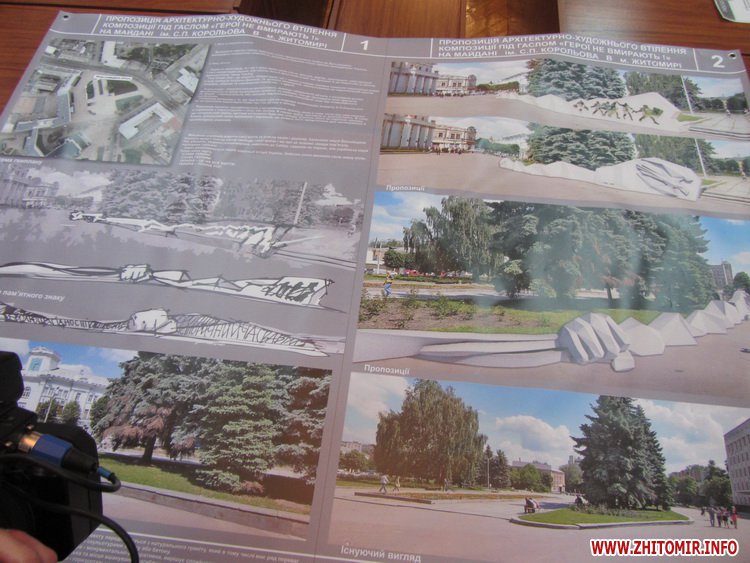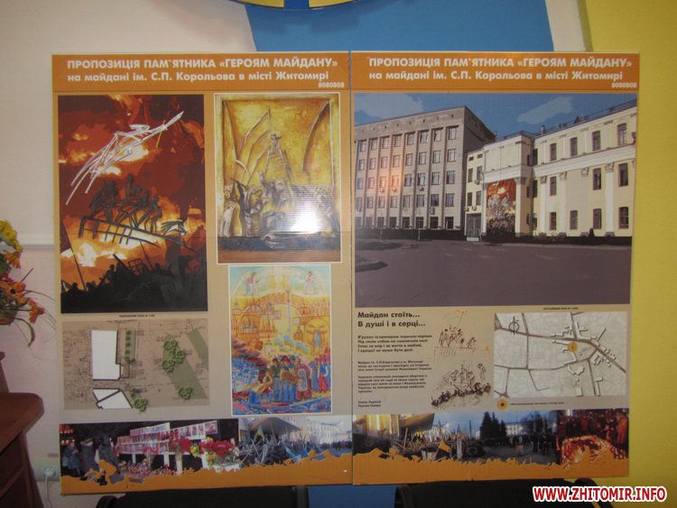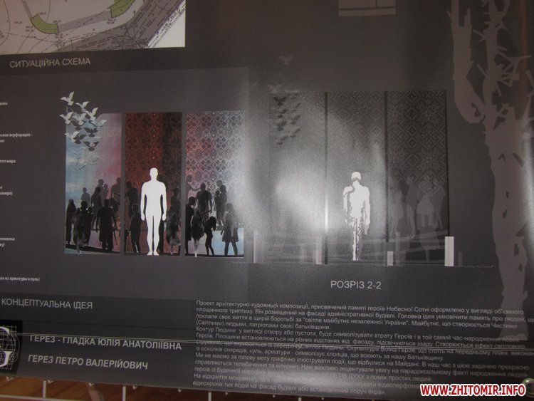 «Житомирською міською радою був оголошений конкурс пам’ятного знаку «Борцям за волю і незалежність України». Було подано близько 15 робіт, вони виставлялися в бібліотеці ім. Ольжича. Але журі прийняло рішення, що конкурс потрібно продовжувати – жодна робота не була такою, щоб її обрати і втілювати у життя. Тоді цей конкурс був розбитий на два – «Героям Небесної сотні», інший – «Борцям за волю і соборність України». На пам’ятний знак «Героям Небесної сотні» була надана одна робота – ось вона. Це пропозиція пам’ятника на майдані Корльова на будівлі адміністрації», - пояснила начальник управління містобудування, архітектури та дизайну міського середовища Житомирської міської ради Євгенія Черкасова.