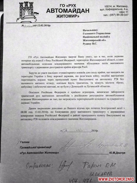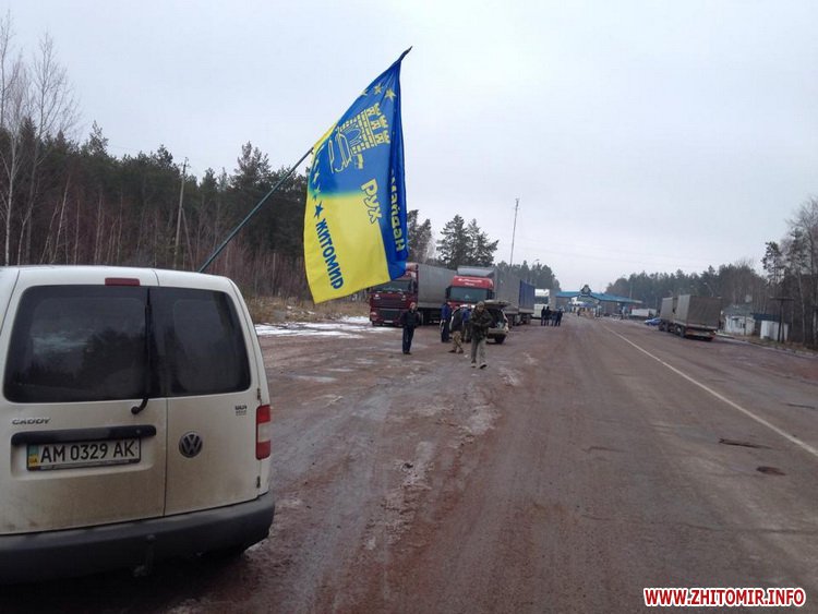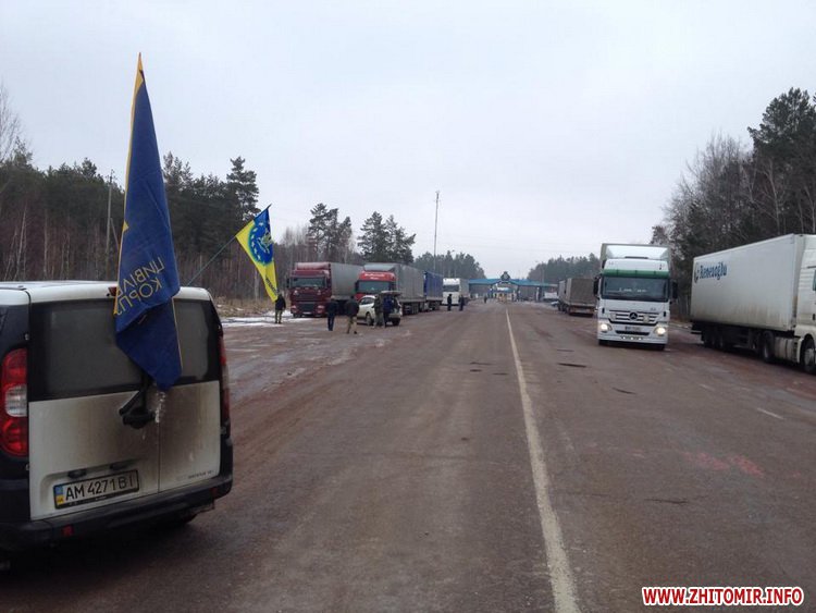 У Житомирській області на пропускному пункті «Виступовичі» громадські активісти вранці 13 лютого розпочали безстрокову акцію з блокування в'їзду в Україну вантажних автомобілів з російськими номерами та товарами.