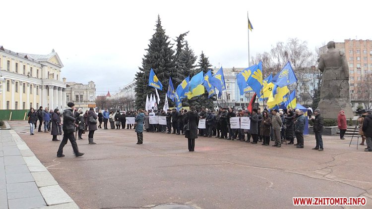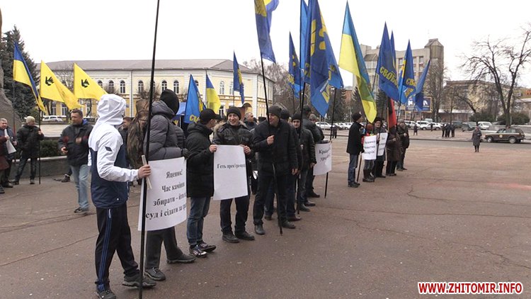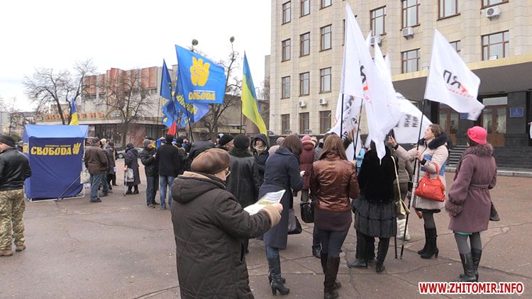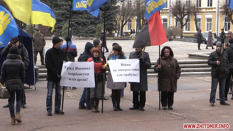 «Країна воює, а Уряд грабує» та «Геть прем’єра-мародера!» - з такими гаслами 16 лютого навпроти будівлі Житомирської обласної ради вишикувалися мітингарі. Під партійними прапорами кількадесят людей, усі вони вимагають відставки чинного Уряду на чолі з Арсенієм Яценюком.