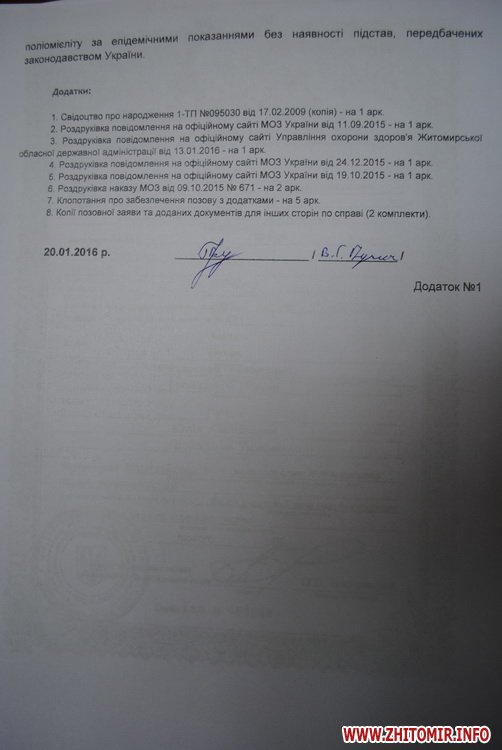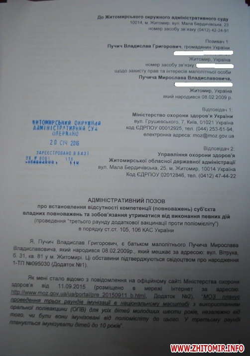 16 лютого об 11.00 у Житомирському адміністративному суді мало відбутися засідання, щодо зупинення вакцинації дітей проти поліомієліту.