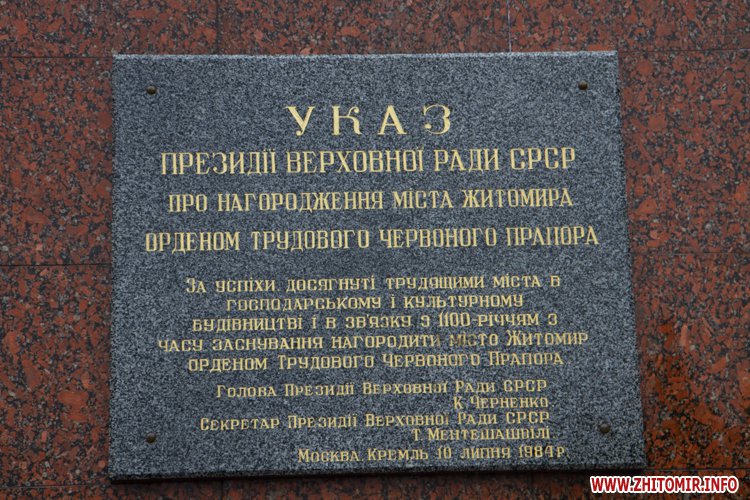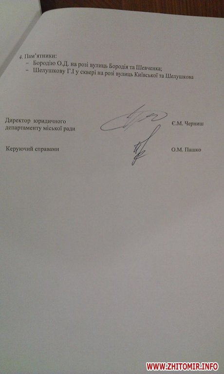 По распоряжению мэра Сергея Сухомлина от 19 февраля 2016 года, управление коммунального хозяйства Житомирского горсовета должно демонтировать памятники, памятные знаки, аннотационные доски и обеспечить их хранение.