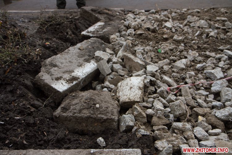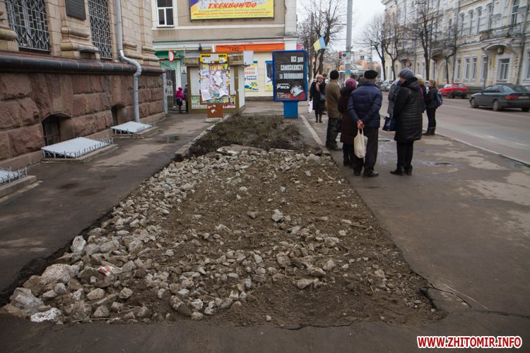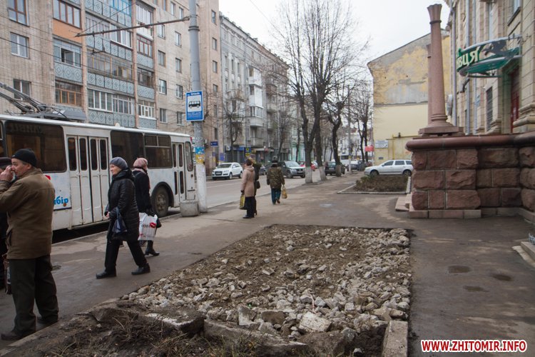По вулиці Великій Бердичівській, 9 комунальники почали розчищати територію для встановлення зупинки зменшивши розміри клумби, яка там знаходилася не один десяток років.