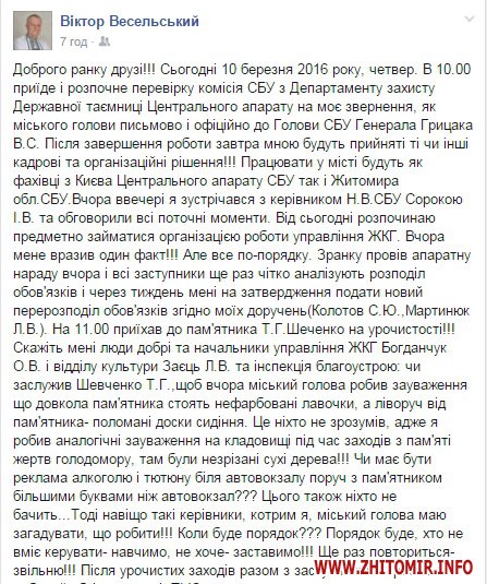 «В 10.00 приїде і розпочне перевірку комісія СБУ з Департаменту захисту Державної таємниці Центрального апарату на моє звернення, як міського голови письмово і офіційно до Голови СБУ Генерала Грицака В.С. Після завершення роботи завтра мною будуть прийняті ті чи інші кадрові та організаційні рішення!!! Працювати у місті будуть як фахівці з Києва Центрального апарату СБУ так і Житомира обл. СБУ».