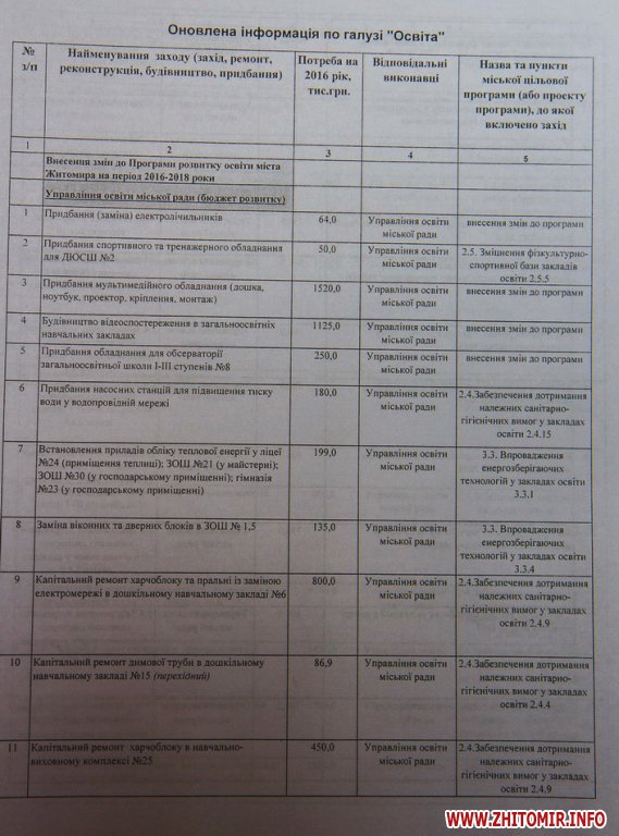 У 2016 році з бюджету розвитку Житомира на галузь «Освіта» планують виділити 41 млн 470,8 тис.грн.