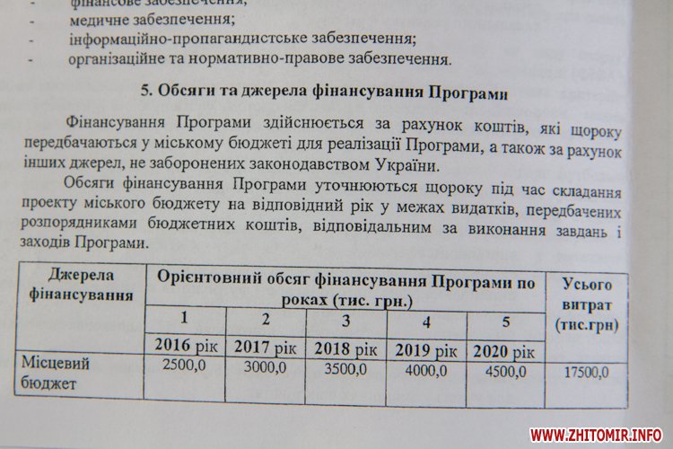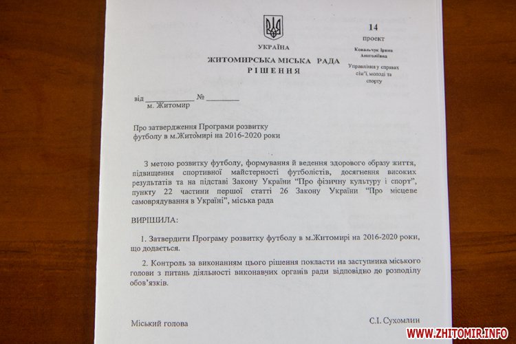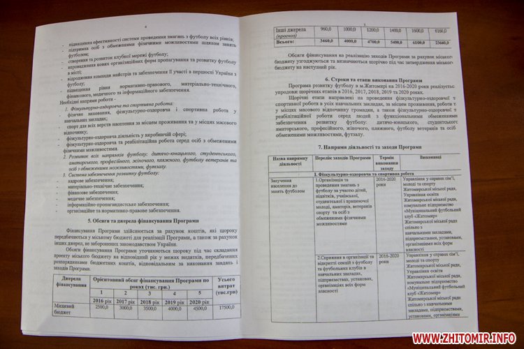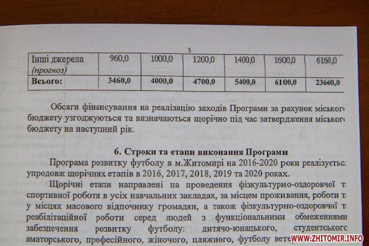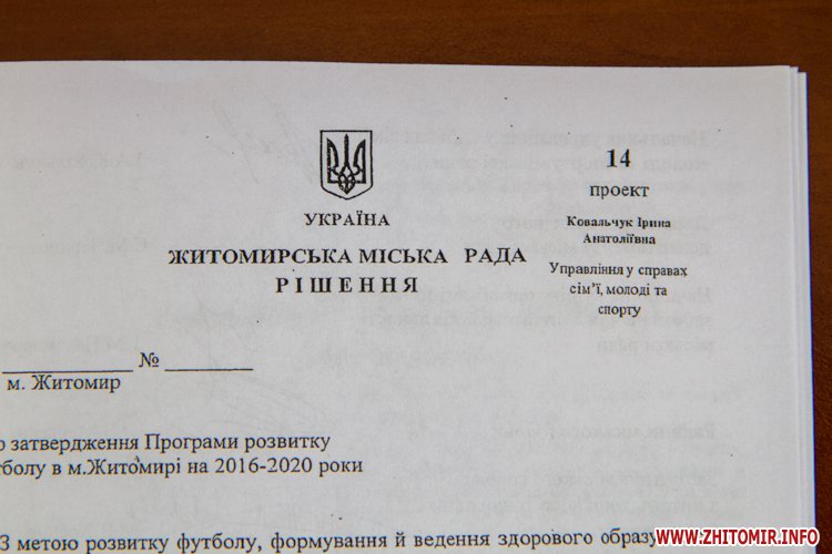 Пронумеровані проекти рішень, які мали розглядати на сесії міської ради 16 березня, журналісти Житомир.інфо отримали від депутатів перед початком пленарного засідання. Під №14 був проект рішення «Про затвердження Програми розвитку футболу в м.Житомирі на 2016-2020 роки», в якому були прописані джерела фінансування: міський бюджет та інші джерела.