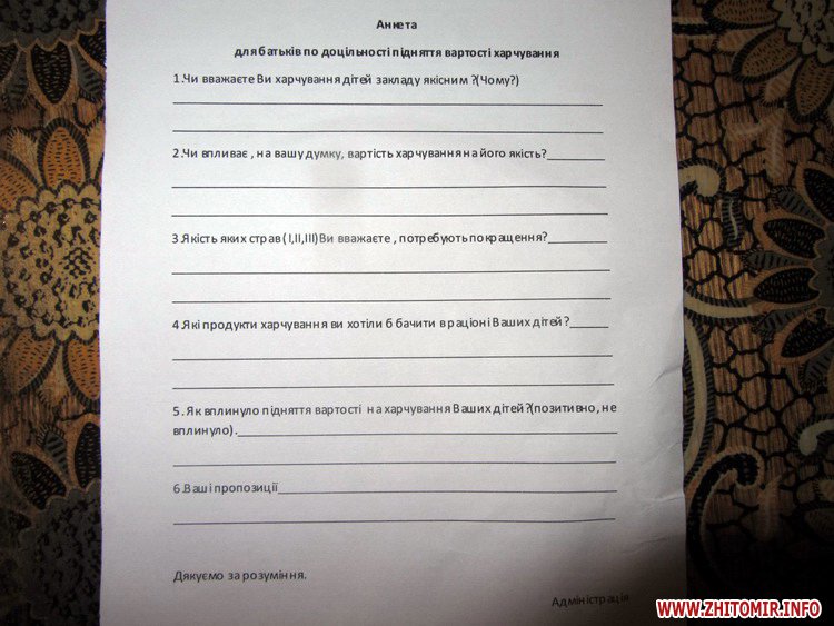 У деяких житомирських дитсадках батькам пропонують заповнити анкету стосовно доцільності підняття вартості харчування.