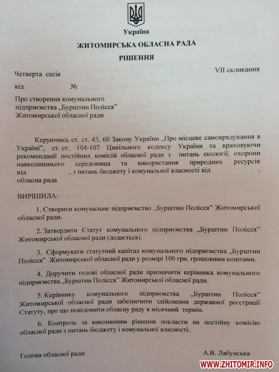 «Доручити голові обласної ради призначити керівника керівника комунального підприємства «Бурштин Полісся» Житомирської обласної ради», – йдеться в проекті рішення.