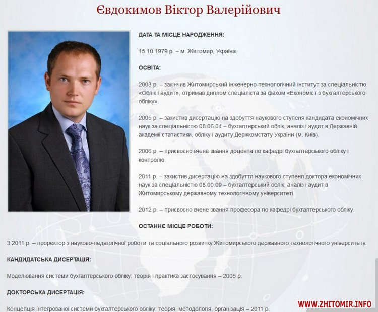 Як повідомляв Житомир.info, за результатами виборів у Житомирському державному технологічному університеті 22 березня, ректором вузу став житомирянин, доктор економічних наук, 36-річний професор Віктор Євдокимов. Його суперником був колишній проректор з наукової роботи ЖДТУ, а нині завідувач кафедри «Процеси, машини і обладнання» ЖНАЕУ, доктор технічних наук, професор Іван Грабар.