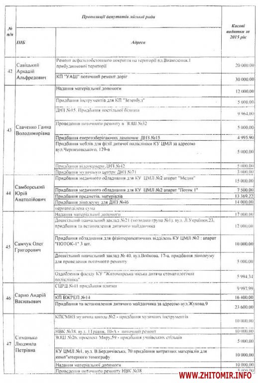 Аркадий Савицкий 20 тыс.грн выделил на асфальтирование придомовой территории по адресу: площадь Освобождения, 1 и отдал 30 тыс.грн КП «УАШ» на текущий ремонт дорог. Все депутатские деньги на асфальтирование придомовой территории по ул.Хлебная, 26 отдал Сергей Онищук. Депутат Василий Дехтяренко направил свои деньги на ремонт помещений частного ЖЭКа «КомЭнерго».