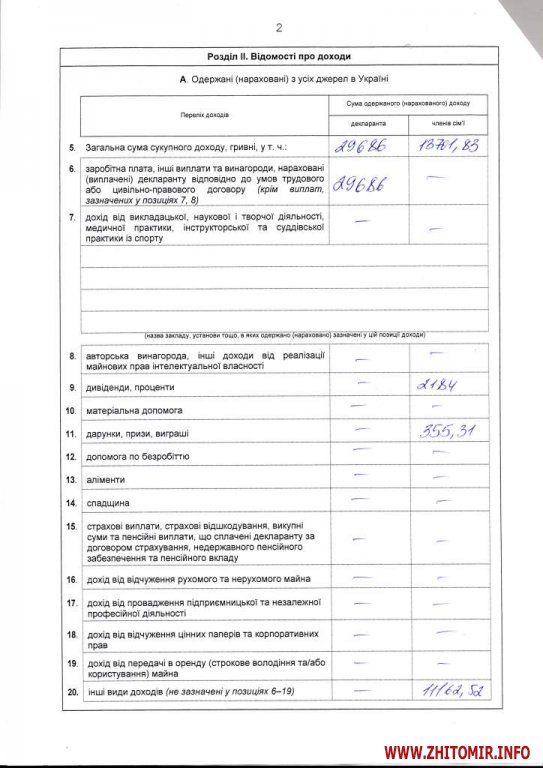 Доходы нового заместителя мэра за 2015 год составляют 29 тыс. 686 грн – зарплата. Доходы членов семьи (жена и две дочери) – 13 тыс. 701,83 грн, из которых: дивиденды – 2 тыс. 184 грн, подарки – 355,31 грн, другие виды доходов – 11 тыс. 162,52 грн.