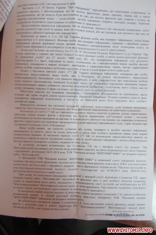 Суд зауважив, що позивачем не наведені факти цілеспрямованого розповсюдження Житомир.info оспорюваної інформації з метою принизити ділову репутацію КП «Житомирводоканал». Крім того, комунальне підприємство скористалося своїм правом на відповідь – на сайті 28 січня 2016 року була розміщена стаття «Житомирський водоканал відреагував на звинувачення щодо використання шкідливого коагулянта».