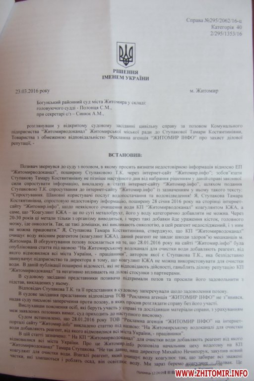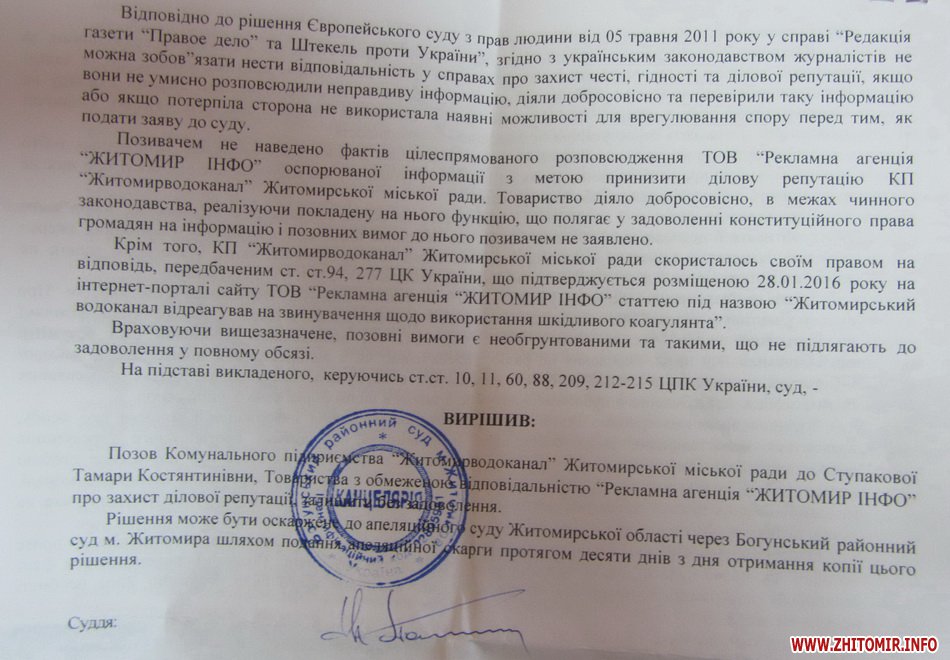 23 березня Богунський районний суд м.Житомира вирішив залишити без задоволення позов комунального підприємства «Житомирводоканал» до колишньої працівниці Тамари Ступакової та сайту Житомир.info про захист ділової репутації.