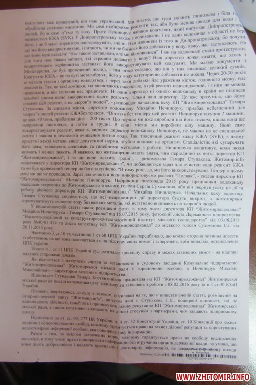 Приводом для позову став матеріал «На Житомирському водоканалі для очистки води добавляють реагент, від якого відмовилися всі міста України, – працівники», опублікований на сайті 28 січня 2016 року.