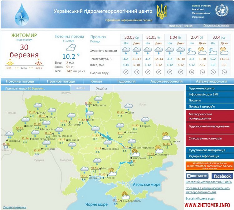 За даними українського Гідрометцентру 31 березня в Житомирі очікується невеликий дощ. Температура повітря +12, +14. А у п’ятницю, 1 квітня, температура повітря становитиме +16+18 градусів, можливий невеликий дощ.
