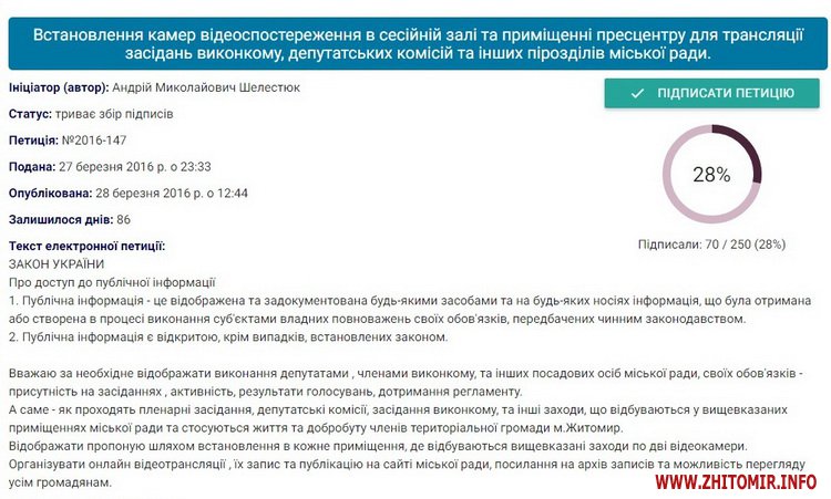 Житомирян просять підтримати петицію за встановлення камер у сесійній залі міської ради та приміщенні прес-центру.