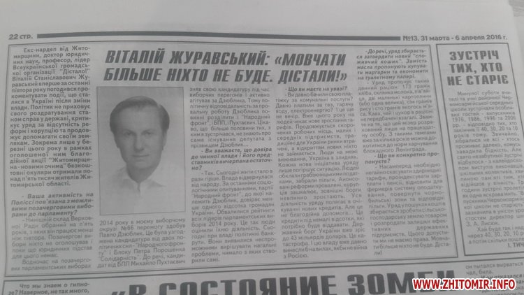 Екс-нардеп від Житомирщини, доктор юридичних наук, професор, лідер Всеукраїнської громадської організації «Дістало!» Віталій Станіславович Журавський вперше за останні півтора року погодився прокоментувати події, що сталися в Україні після зміни влади. Політик не приховує свого роздратування станом справ у державі, критикує Уряд за відсутність реформ і корупцію та продовжує допомагати своїм землякам. Зокрема, лише у березні цього року в рамках оголошеної ним благодійної акції «Житомирщина – новими очима» безкоштовні окуляри отримали понад п’ять тисяч мешканців Житомирської області.