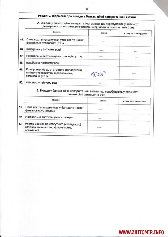 Размер взносов в уставной фонд предприятий в 2015 году составил 15,05 грн. Денег на банковских счетах и финансовых обязательств у первого заместителя мэра нет.