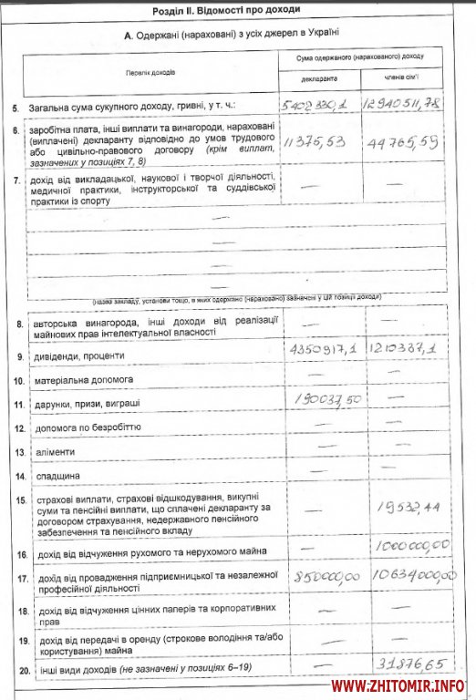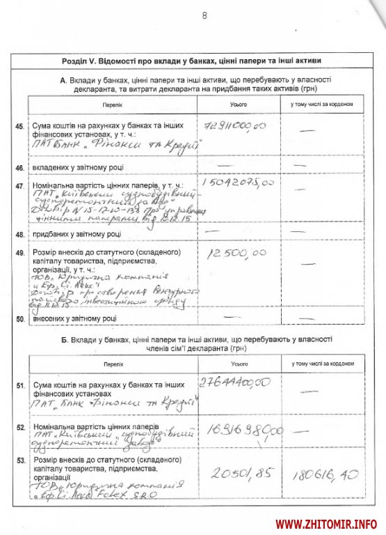 На банковских счетах членов семьи – 27 млн 644 тыс. 400 грн (в 2014 г. – 18 млн 322 тыс. 588 грн), номинальная стоимость ценных бумаг – 16 млн 916 тыс. 980 грн, размер взносов в уставной фонд предприятий – 20 тыс. 501,85 грн, в т.ч. за рубежом – 180 тыс. 616,4 грн, что явно больше общей суммы взносов.