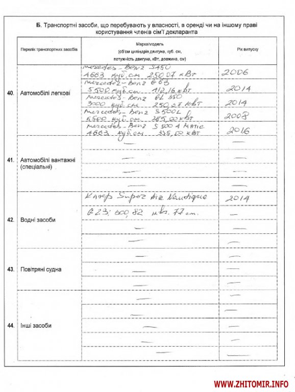 У председателя облсовета собственного транспорта нет, членам семьи принадлежат пять автомобилей марки Mercedes-Benz: к трем, указанным в декларации за 2014 год (один 2006 г.в. и два 2014 г.в.) добавился еще Mercedes-Benz S 500 L 2008 г.в. и Mercedes Benz S500 4 Matiс 2016 г.в. Напомним – это указанно в декларации за прошлый, 2015 год. В собственности семьи также есть катер Super Air Nautique G23, выпущенный в 2014 году.
