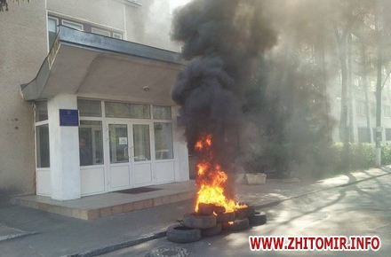 Біля будівлі ГУ Держгеокадастру у Житомирській області учасники акції підпалили шини.