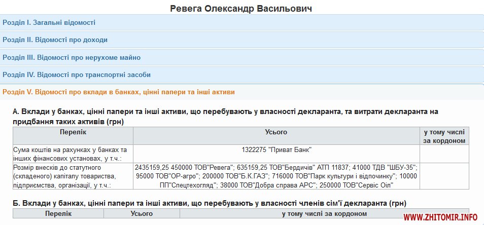 На счетах в банках и финансовых учреждениях у Александра Ревеги 1 млн 322 тыс. 275 грн (в 2014 году – 1 млн 260 тыс. грн), но в декларации нет информации о вкладах в 2015 году. Взносы в уставной фонд предприятий составляют 2 млн 435 тыс. 159 грн, из которых: 450 тыс.грн – ООО «Ревега»; 635 тыс. 159,25 грн – ООО «Бердичев» АТП 11837; 41 тыс.грн – ОДО «ШБУ-35»; 95 тыс.грн – ООО «ОР-агро»; 200 тыс.грн – ООО «Б.К.ГАЗ»; 716 тыс.грн – ООО «Парк культуры и отдыха»; 10 тыс.грн – ЧП «Спецтехогляд»; 38 тыс.грн – ООО «Добра справа АРС»; 250 тыс.грн – ООО «Сервис Оил».