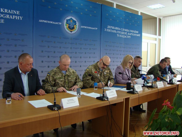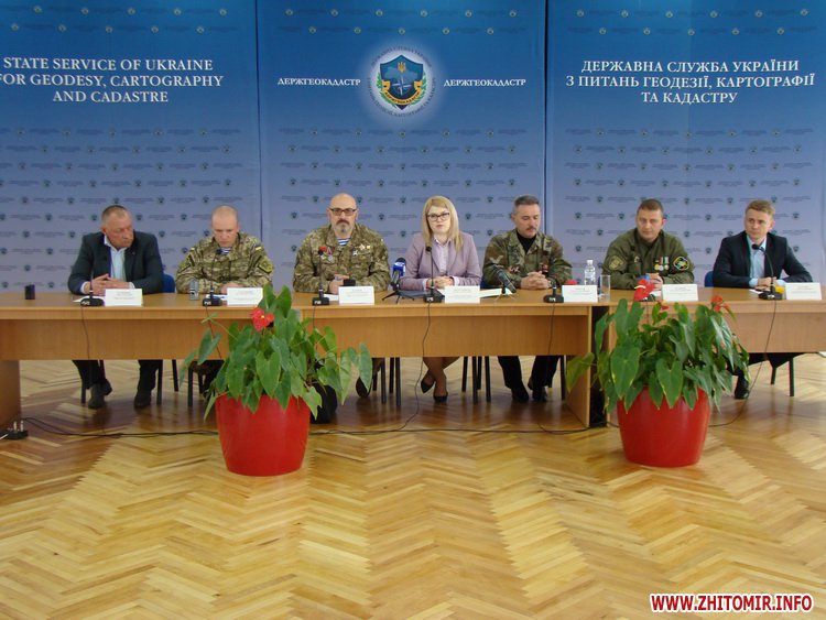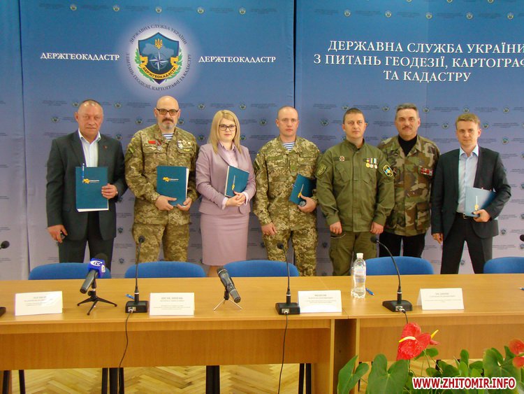«Державна служба України з питань геодезії, картографії та кадастру та громадські організації учасників АТО та ветеранів у Житомирській області уклали меморандум про взаєморозуміння та співпрацю. Його мета – забезпечення ефективної співпраці та консолідації зусиль щодо забезпечення військовослужбовців Житомирщини земельними ділянками. Підписання документа відбулося 18 квітня у Києві в конференц-залі Держгеокадастру. Усвідомлюючи спільну відповідальність за стан справ у забезпеченні учасників антитерористичної операції земельними ділянками, сторони домовилися вести конструктивний діалог та сприяти максимальній прозорості процесу відведення земель, розгляду та подання документів. Підписанти зобов’язалися обопільно проводити моніторинг виконання вимог законодавства про статус ветеранів та їх соціальний захист. Представники громадських організацій учасників АТО та землевпорядники регулярно проводитимуть консультації з проблемних питань. Пошук спільних рішень дозволить виключити виникнення конфліктних ситуацій у забезпеченні військових земельними ділянками», - йдеться у повідомленні.