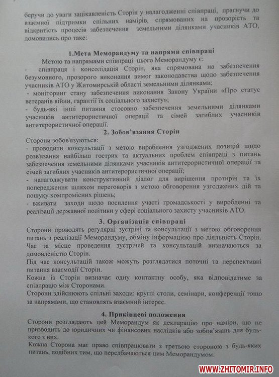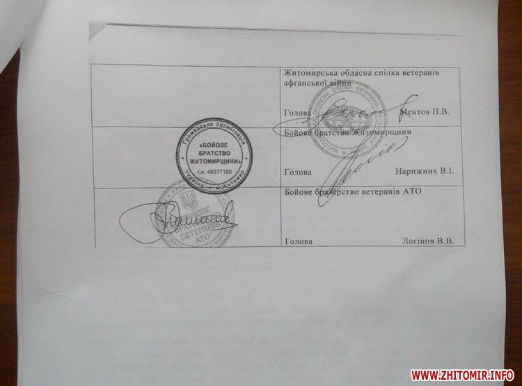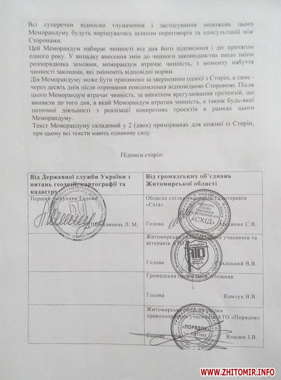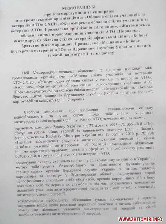 Як повідомляв Житомир.info, прес-служба Держгеокадастру 18 квітня розповсюдила інформацію про те, що Державна служба України з питань геодезії, картографії та кадастру та громадські організації учасників АТО та ветеранів у Житомирській області уклали меморандум про взаєморозуміння та співпрацю. У відомстві назвали підписантів: «Обласна спілка учасників та ветеранів АТО «СХІД», «Житомирська обласна спілка учасників та ветеранів АТО», Громадська організація «Атошник», «Житомирська обласна спілка правоохоронців учасників АТО «Порядок», Житомирська обласна спілка ветеранів афганської війни, «Бойове братство Житомирщини», Громадське об’єднання «Бойове братерство ветеранів АТО». Громадська організація «Атошник» спростувала інформацію про підписання її представниками меморандуму з Держгеокадастром. Народний депутат Борислав Розенблат повідомив про звільнення свого помічника Валерія Логінова, який підписав меморандум.