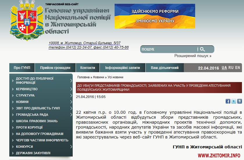 Як повідомляв Житомир.info, керівний склад ГУ Нацполіції у Житомирській області в квітні буде проходити переатестацію в Києві, переатестація особового складу має завершитися до червня цього року.