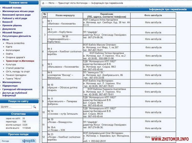 На сайті Житомирської міської ради, окрім інформації про перевізників, з’явилися фото маршруток, які повинні їздити містом. Також житомиряни можуть долучитись до моніторингу роботи транспорту.