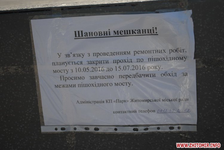 Начальник управління комунального господарства Житомирської міської ради Олександр Марцун в коментарі Житомир.info розповів, що оголошення повісили, щоб попередити жителів, але поки закривати міст не будуть.
