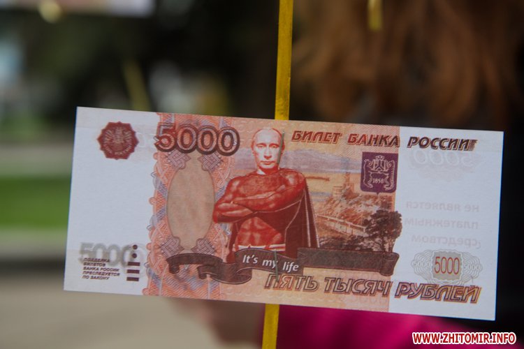 5 травня о 18.00 у Житомирі на майдані Корольова відбулася акція протесту проти банків агресора. Під час заходу організатори оприлюднили заяву щодо неприпустимості діяльності московських фінустанов в Україні та запустили в небо повітряні кульки з підробленими російськими рублями.