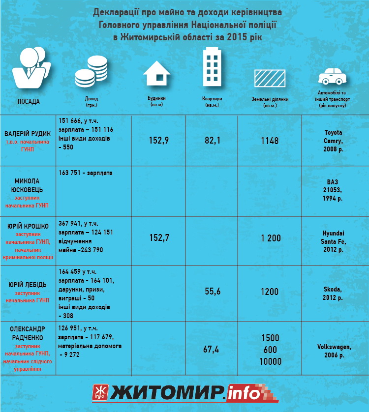 Руководство главного управления Национальной полиции в Житомирской области зарабатывает от 124 до 164 тыс. грн в год и все имеют собственные автомобили.