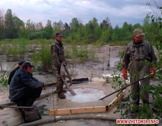 Поліцейські, працівники Управління захисту економіки ДЗЕ Національної поліції спільно з військовослужбовцями Національної гвардії виявили нелегалів у лісовому масиві неподалік с. Обища Олевського району. Троє чоловіків саме налагодили процес видобутку і за допомогою мотопомпи розмивали грунт.