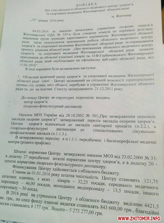 Комісія, яку створили в управлінні охорони здоров’я облдержадміністрації представила довідку про стан діяльності обласного медичного центру здоров’я, датовану 10 травня: вони не заперечують проти припинення центру здоров’я шляхом приєднання до обласної лікарні.
