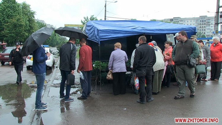 Поки люди стоять у черзі, поліцейські разом з інспекцією з благоустрою оформлюють на продавця протокол про правопорушення. Підприємець розмістився навпроти ринку «Хмільники» поруч з автобусною зупинкою, торгівля у цьому місці заборонена.