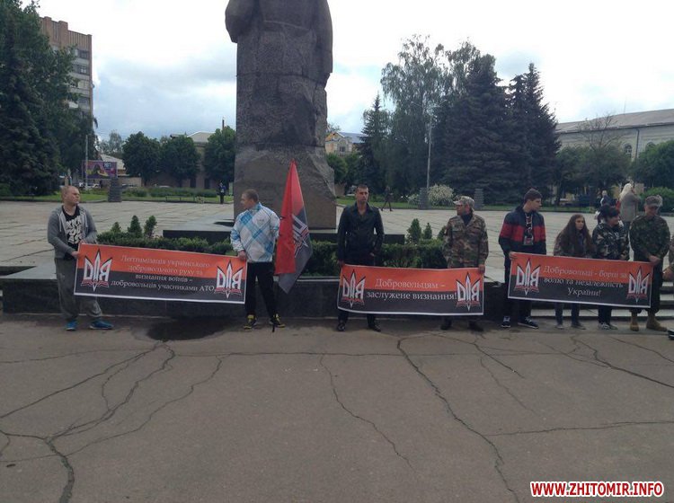 «Біля облдержадміністрацією зібралось три групи людей: одні з плакатами: «Легітимізація українського добровольчого руху та визнання воїнів-добровольців – учасниками АТО», «Добровольцям – заслужене визнання», «Добровольці – борці за волю та незалежність України». Ще одна група людей вийшла на протест стосовно вибухівки марки «Ера», яка зараз використовується на кар’єрах і є небезпечною. На сесії буде винесене це питання. Треті, які стоять по центру без плакатів, це активісти, які обговорюють питання, які варто нагально розглянути на сесії: стосовно Держгеокадастру, фонду соцзахисту. Якщо депутати на сесії не розглядатимуть першочергово ці питання, а будуть затягувати, то активісти розглядають можливість блокування трибуни», – розповів журналіст Житомир.info, який перебуває на місці події.