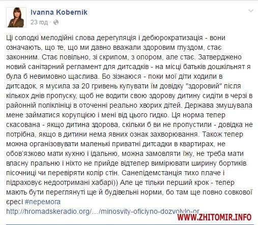 «Затверджено новий санітарний регламент для дитсадків - на місці батьків дошкільнят я була б невимовно щаслива. Бо зізнаюся - поки мої діти ходили в дитсадок, я мусила за 20 гривень купувати їм довідку "здоровий" після кількох днів пропуску, щоб не водити свою здорову дитину сидіти в черзі в районній поліклініці в оточенні реально хворих дітей. Держава змушувала мене займатися корупцією і мені від цього гидко. Ця норма тепер скасована - якщо дитина здорова, скільки б ви не пропустили - довідка не потрібна, якщо в дитини нема явних ознак захворювання», - написала Коберник.