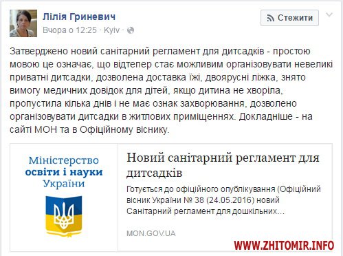 «Простою мовою це означає, що відтепер стає можливим організовувати невеликі приватні дитсадки, дозволені доставка їжі, двоярусні ліжка, знято вимогу медичних довідок для дітей, якщо дитина не хворіла, пропустила кілька днів і не має ознак захворювання, дозволено організовувати дитсадки в житлових приміщеннях», - написала Гриневич.