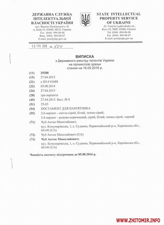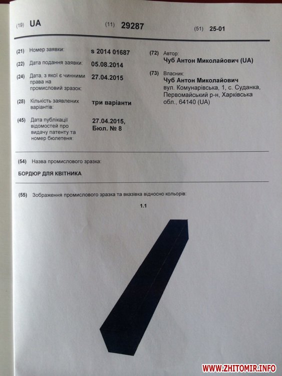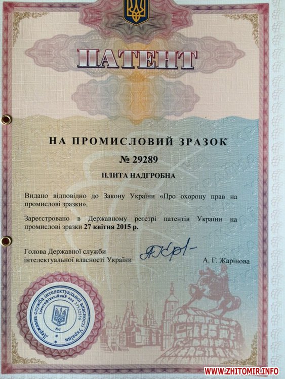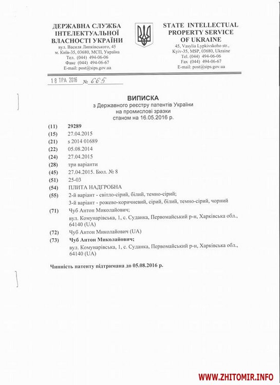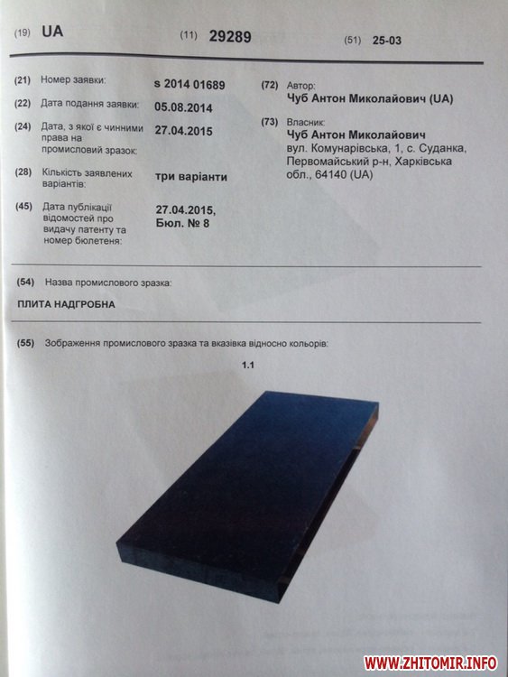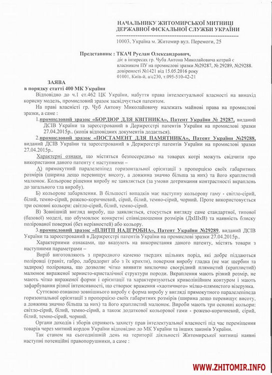 Згідно з інформацією, яку подає Віталій, 27 квітня 2015 року громадянин України Антон Миколайович Чуб запатентував в Державній службі інтелектуальної власності право на промислові зразки найбільш поширених виробів з граніту: бордюр для квітника, постамент для пам'ятника і плиту надгробну. Згідно з чинним законодавством, кожен, хто використовує дані вироби, відтепер повинен укласти угоду з власником патенту і платити йому за це.