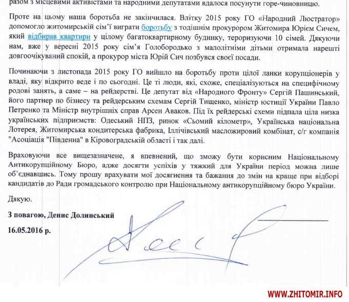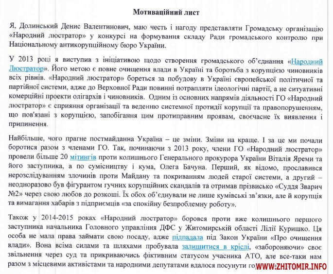 «Я впевнений, що зможу бути корисним Національному Антикорупційному Бюро, адже досягти успіхів у тяжкий для України період можна лише об’єднавшись. Тому прошу врахувати мої досягнення та бажання до змін на краще при виборі кандидатів до Ради громадського контролю при Національному антикорупційному бюро України», - йдеться у мотиваційному листі Дениса Долинського.
