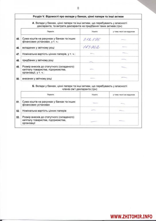 На банковских счетах – 312 тыс. 595 грн, из которых 183 тыс. 902 грн вложены в прошлом году.