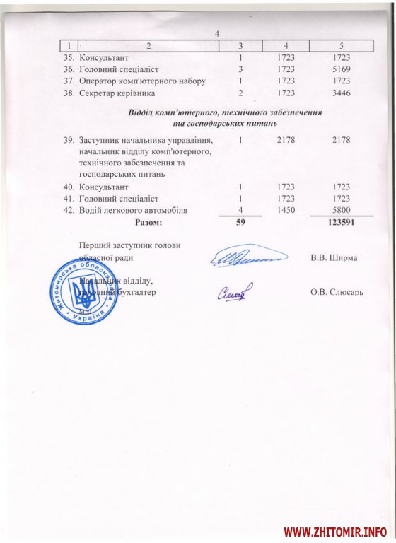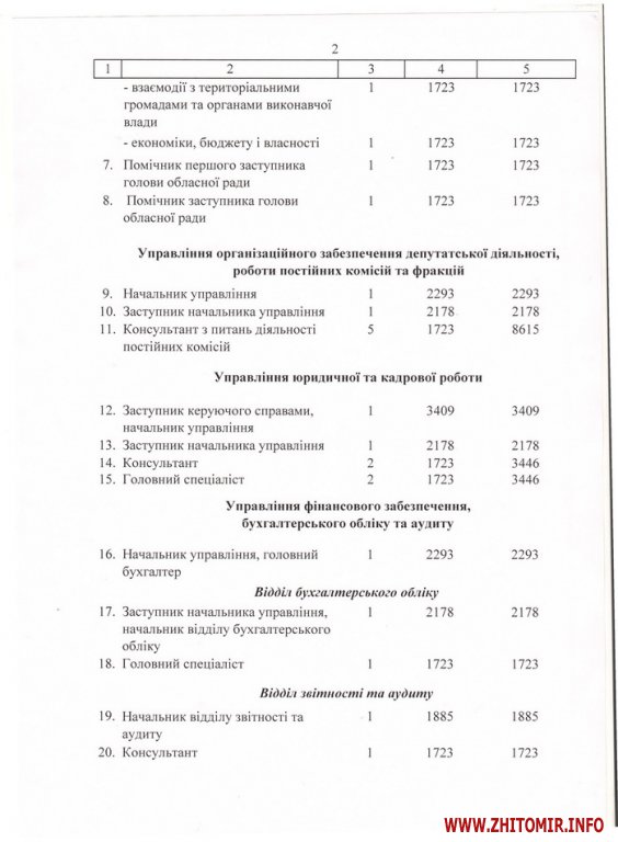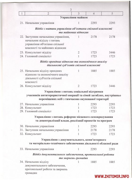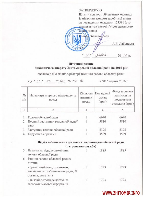 Голова Житомирської облради Анжеліка Лабунська 31 травня затвердила штатний розпис та посадові оклади виконавчого апарату обласної ради на 2016 рік.