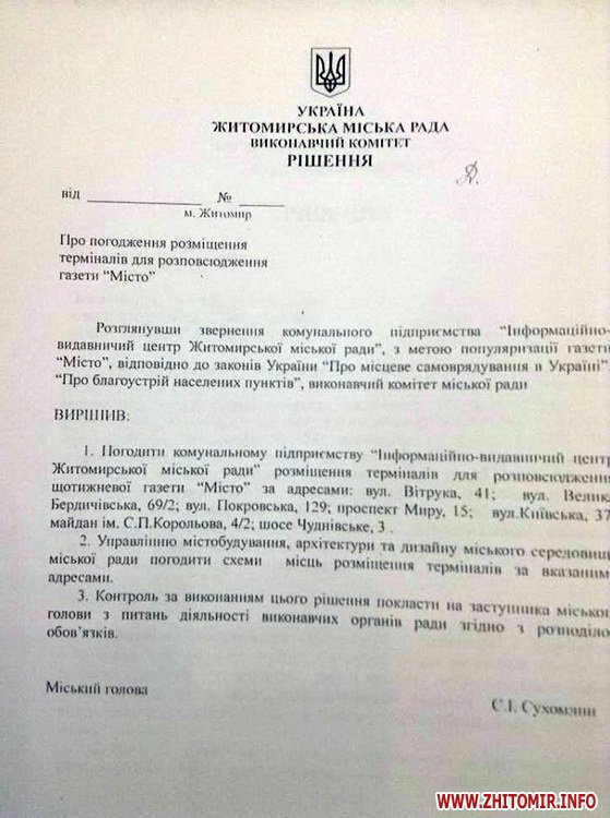 «Погодити комунальному підприємству «Інформаційно-видавничий центр Житомирської міської ради розміщення терміналів для розповсюдження щотижневої газети «Місто» за адресами: вул. Вітрука, 41, вул. Велика Бердичівська 69/2, вул. Покровська, 129, просп. Миру, 15, Київська, 37, м-н Корольова, 4/2, шосе Чуднівське, 3», - йдеться у рішенні виконкому.
