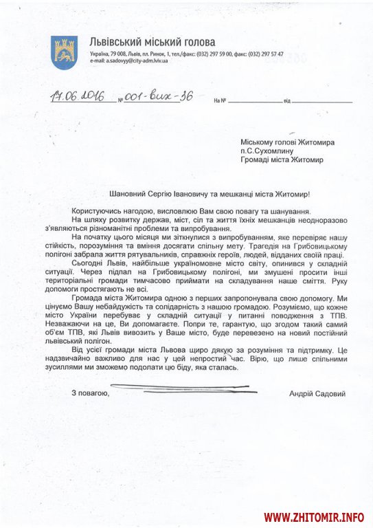 «Громада міста Житомира однією з перших запропонувала свою допомогу. Ми цінуємо вашу небайдужість та солідарність з нашою громадою. Розуміємо, що кожне місто України перебуває у складній ситуації у питанні з поводженням ТПВ (сміттям). Незважаючи на це, ви допомагаєте. Попри те, гарантую, що згодом такий самий об’єм ТПВ, які Львів вивозить у ваше місто, буде перевезено на новий постійний львівський полігон», - йдеться у листі Садового, який опублікований на сайті міської ради.