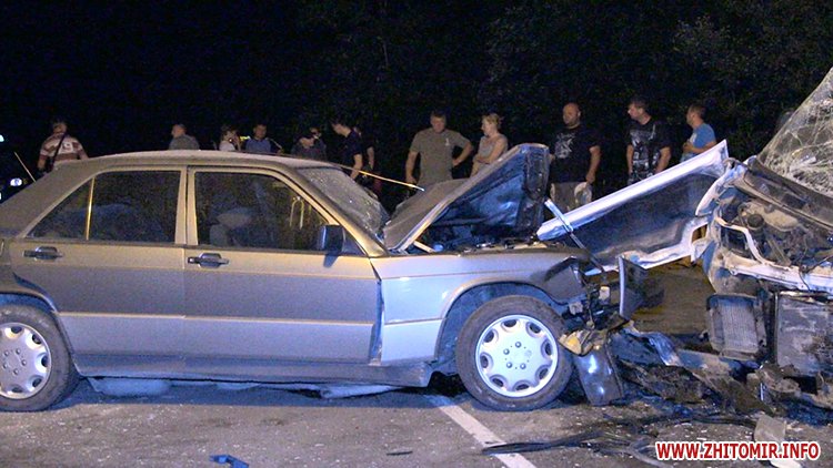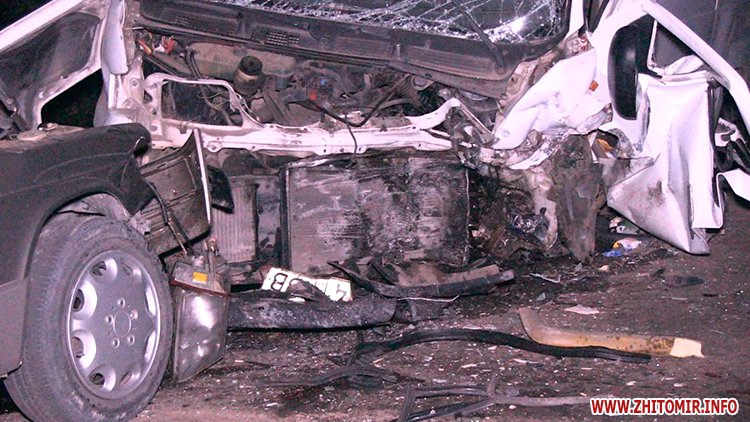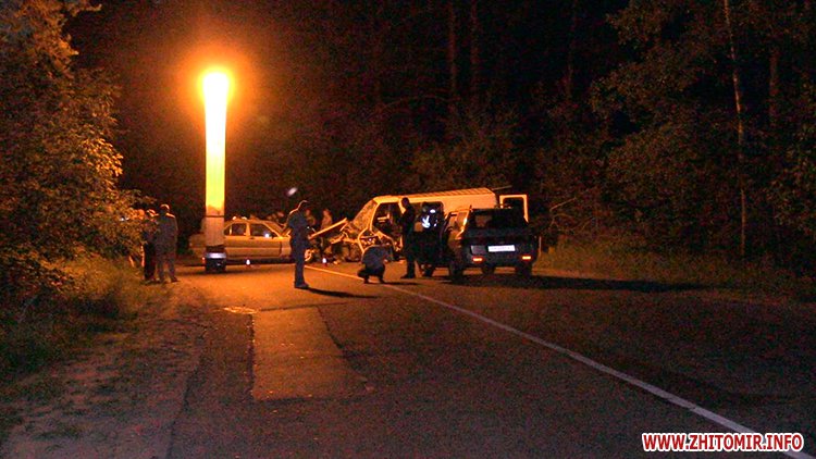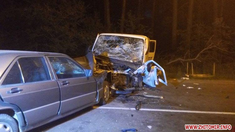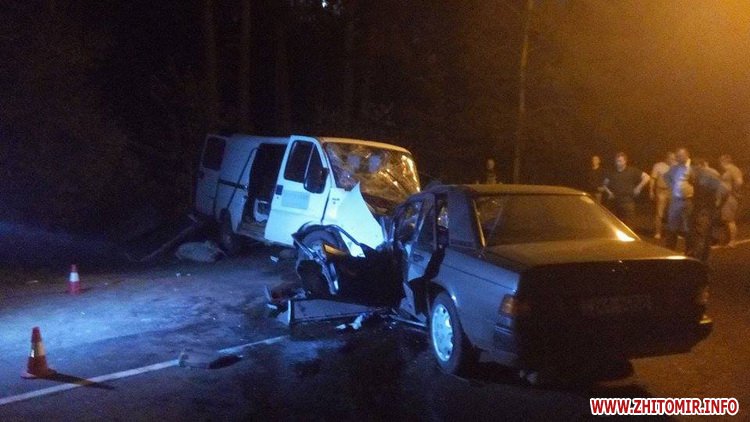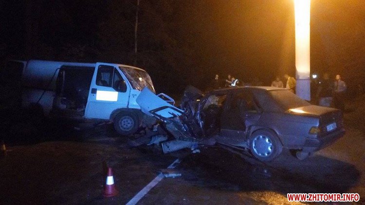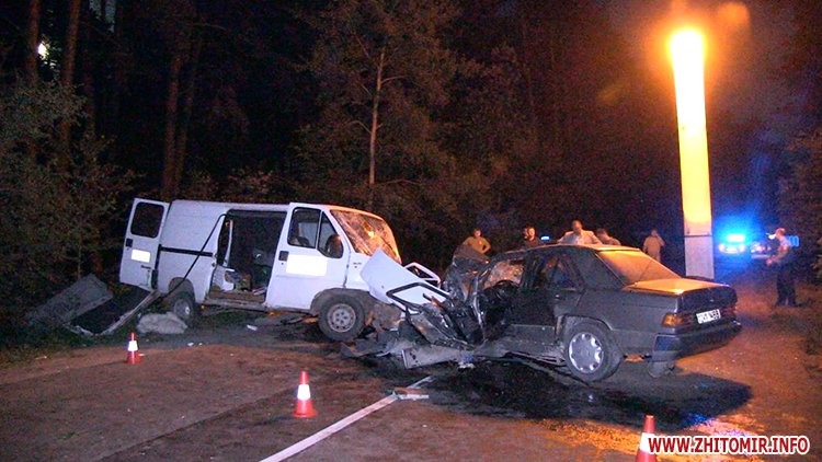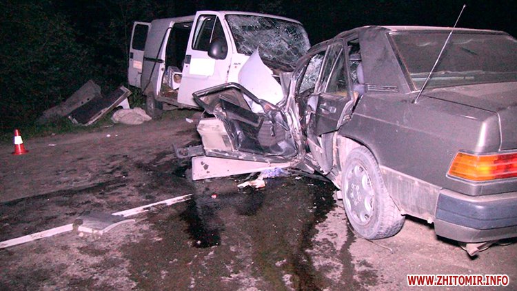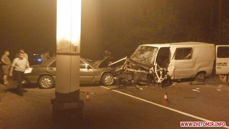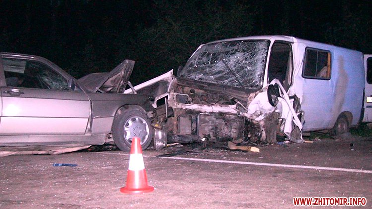 У Житомирі на Богунії близько 21.00 за Центральною міською лікарнею №2 автомобіль Mercedes зіштовхнувся з мікроавтобусом Fiat. Водій легковика загинув, 7 людей, які їхали в мікроавтобусі, в лікарні, серед них є дитина.