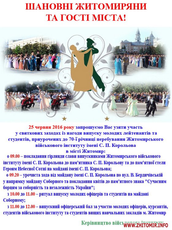 «25 червня 2016 запрошуємо вас взяти участь у святкових заходах з нагоди випуску молодих лейтенантів та студентів, приурочених до 70-ї річниці з нагоди перебування Житомирського військового інституту імені С.П. Корольова в місті Житомир.