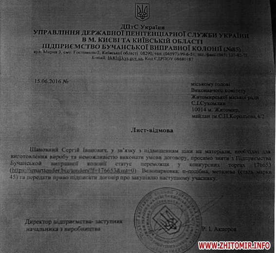 Лист-відмова від 15 червня директора підприємства - заступника начальника з виробництва колонії на ім’я контактної особи замовника торгів, мера Житомира Сергія Сухомлина, розміщений на сайті електронних закупівель ProZorro.